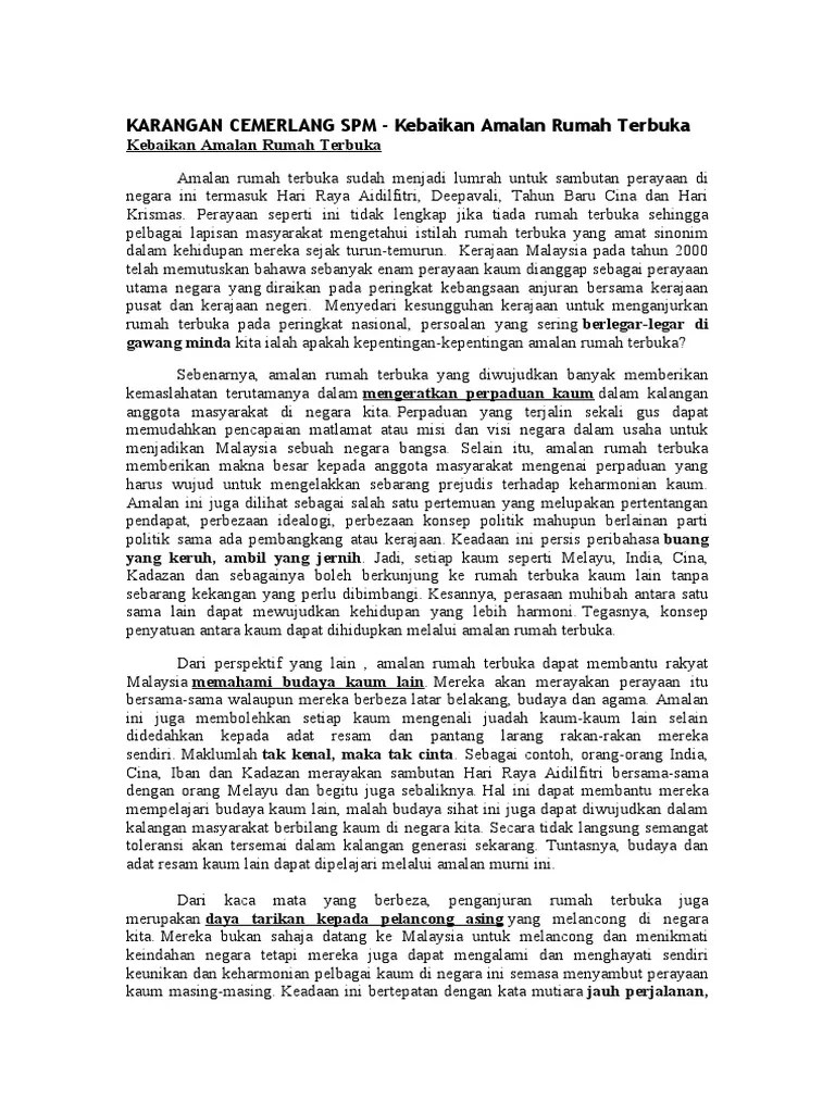 Pelbagai soalan yang boleh dijadikan tajuk dalam penulisan karangan yang berkaitan dengan kepelbagaian kaum, . Konsep rumah terbuka ini memang perlu diteruskan dan dijadikan amalan kerana banyak kebaikannya. Amalan rumah terbuka sudah menjadi lumrah untuk sambutan perayaan di negara ini termasuk hari raya aidilfitri, deepavali, tahun baru cina dan hari krismas. Kebaikan amalan rumah terbuka amalan rumah terbuka sudah menjadi lumrah dalam kalangan masyarakat malaysia. Amalan rumah terbuka sudah menjadi lumrah untuk sambutan perayaan di negara ini termasuk hari raya aidilfitri, deepavali, tahun baru cina .